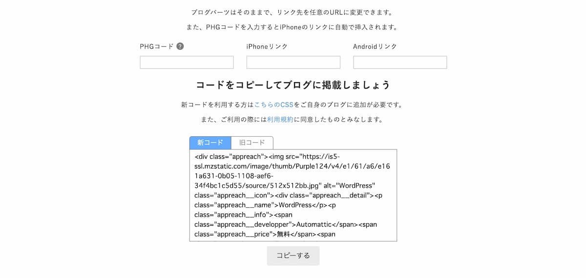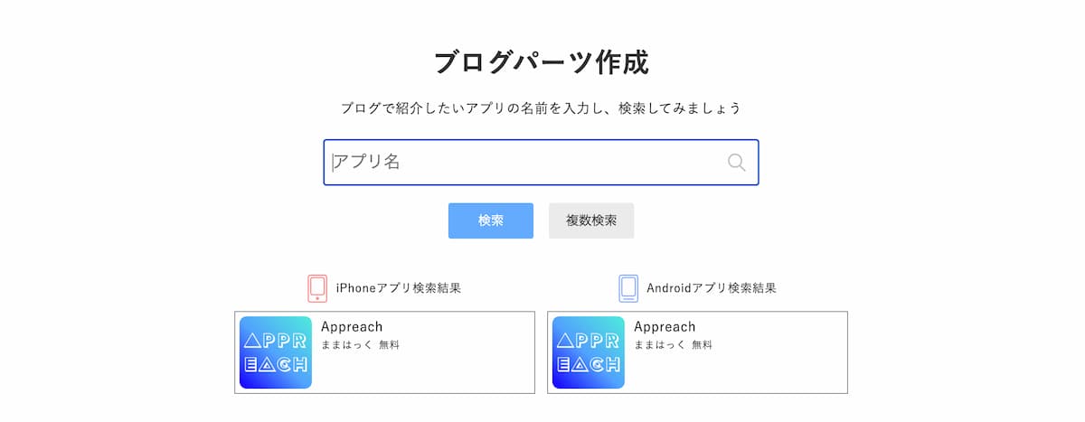アプリの名前を入れるだけでブログパーツに必要な情報を整えてくれます。