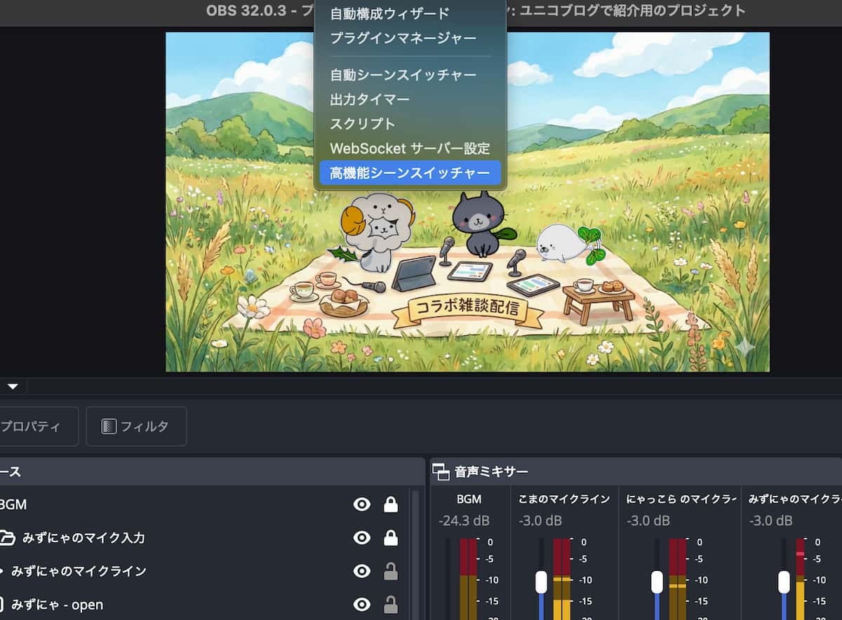 続いて、OBS Studioのシーンに設定されている画像にアニメーションをつける作業に入ります。